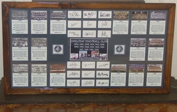 Personally signed on white cards by 18 Past Champions of the CARLTON football club