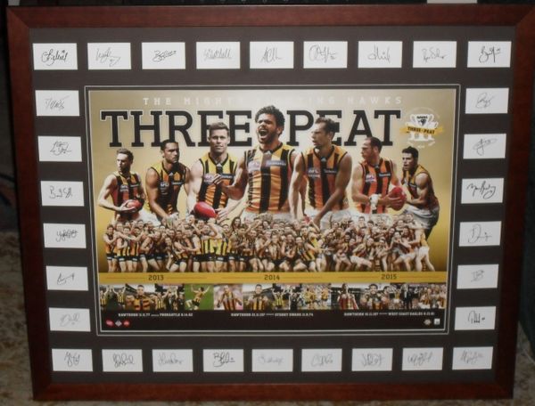 A beautifully Framed Tribute to Hawthorn Football club's Historic Back to Back to Back Premiership wins of 2013 & 2014 & 2015