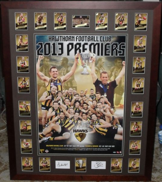 Comes with a 2013 AFL Approved Poster and AFL approved Select card set and finished with 2 premiership signatures