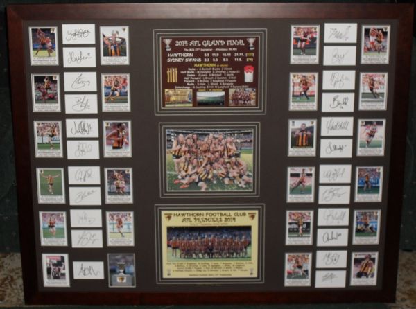 Personally signed on white card by Alistair Clarkson (Coach) Luke Hodge(Captain) Jarred Roughead, Sam Mitchell, Taylor Duryea, Ben McEvoy, Matt Suckling, Jordon Lewis, Will Langford, Luke Bruest, Bradley Hill, Issac Smith, Paul Puopolo, Ben Stratton, Jack Gunston, Peter Burgoyne, Liam Shiels, Josh Gibson, Grant Birchell, Cyril Rioli, Brian Lake, Matthew Spangher and David Hale