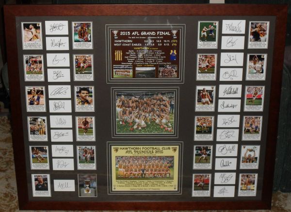Personally signed on white card by Alistair Clarkson (Coach) Luke Hodge(Captain) Jarred Roughead, Sam Mitchell, Taylor Duryea, Ben McEvoy, Matt Suckling, Jordan Lewis, Ryan Schoenmakers, Luke Bruest, Bradley Hill, Issac Smith, Paul Puopolo, Ben Stratton, Jack Gunston, Peter Burgoyne, Liam Shiels, Josh Gibson, Grant Birchall, Cyril Rioli, Brian Lake, James Frawley and David Hale