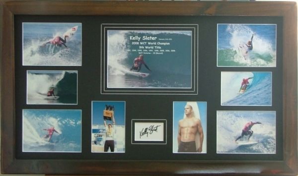Personally signed on white card by Kelly Slater